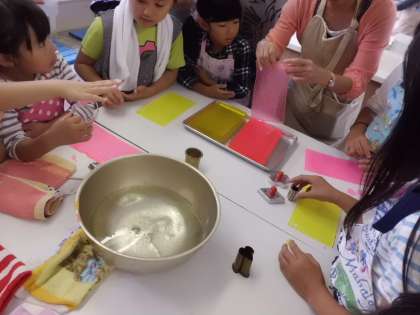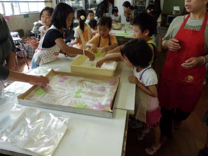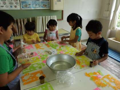 色とりどりの和菓子の材料を思い思いに型抜きし,砂糖にまぶしていきました。