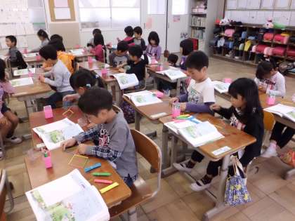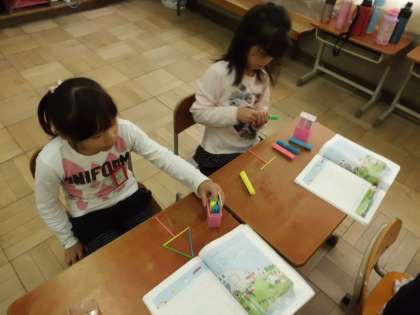 この形を作るのに何本の棒が必要かを考えたり,2本だけ棒を動かして左向きのお魚を右向きにしてみたり,楽しみながら活動を進めることができました。