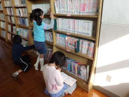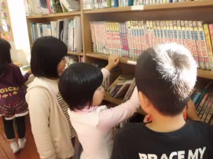 「今日は何の本を借りようかな。」,「この本おもしろかったで。」と楽しく図書を選んでいます。