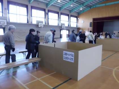 また,体育館にて避難生活を送る場合の,居住スペースや更衣室,簡易トイレなどを見学しました。