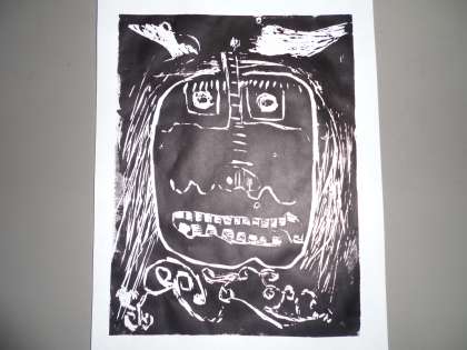 高学年は,「獅子舞」も線彫りで挑戦しました。彫る場所によって彫刻刀を使い分けました。目が強そうでしょ。髪の毛も一本一本安全に気をつけながら丁寧に取り組みました。