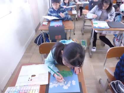 彫刻刀で彫った版に,絵の具で色をつけ,