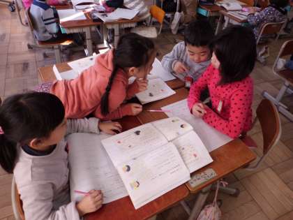 グループごとに果物屋さん,お花屋さんなどのお店を決め,それぞれのお店に並べる商品や値段を考えています。