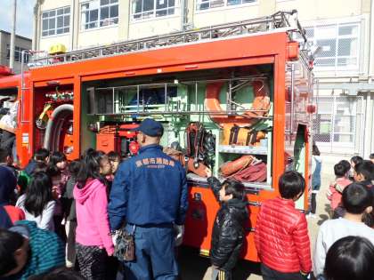 また,消防署の方にも来ていただき,避難をするときに大切なことについて教えていただきました。最後には,本物の消防車も見せていただきました。