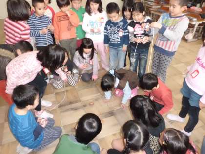 決められた枠の中で,誰のこまが一番長く回せるか競争します。