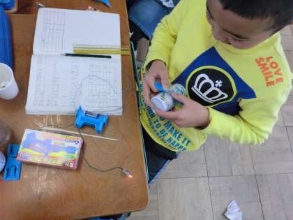 アルミ缶や10円玉,クリップなどをはさむと明かりがつきました!