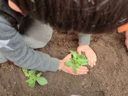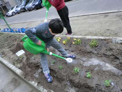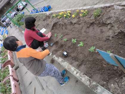 カップから取り出して,丁寧に一つずつ植えていきました。最後には,水をしっかりあげて…。「大きくなあれ。」