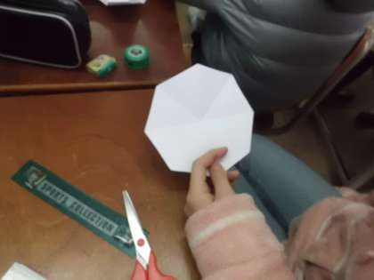 今日は,紙に円をかいて,そこから六角形と八角形を作りました。次回は,それぞれの形の辺の長さや角の大きさを調べていきます。