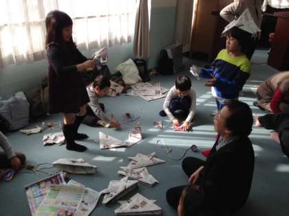 広告やチラシで,紙でっぽうを作りました。丁寧に折り目を折らないと音が鳴りにくく,子どもたちは「アイロンしないと!」などと言いながら一生懸命作っていました。