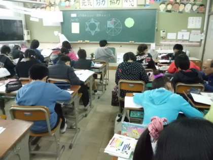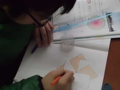 今日は,正多角形をもとにして,模様をかきました。少し複雑な模様だったこともあり,教科書とにらめっこをしながら黙々と取り組んでいる様子でした。