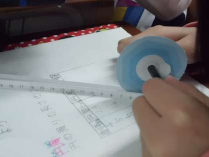 今日は,円周測定マシーンを使って,直径4cmから8cmの円周の長さを測り,円周率を求めました。円周は直径の約3.14倍になることがわかりました。