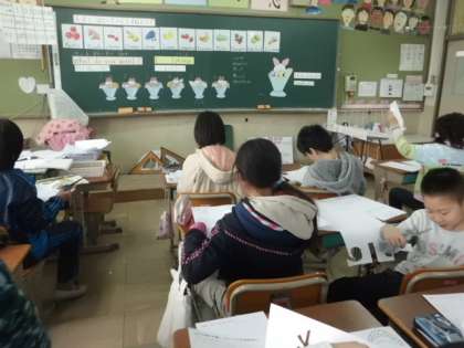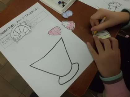2組では,外国語活動の授業を行いました。「What do you want?」という英語を使って,友達に欲しい果物を尋ね,フルーツパフェを作りました。