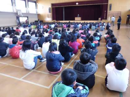 全校集会で校長先生のお話を聞きました。