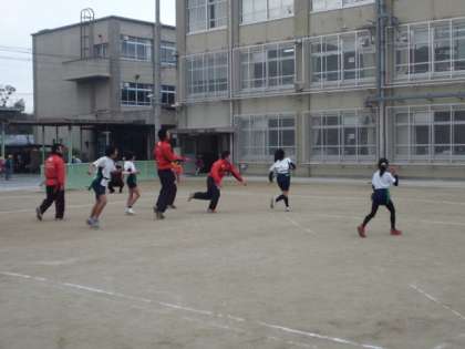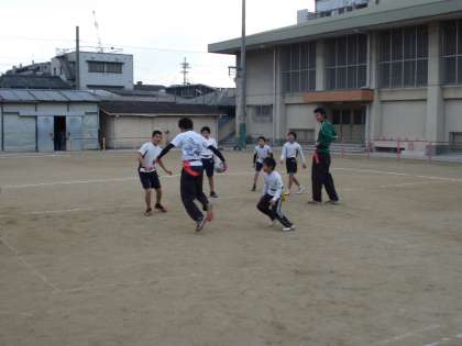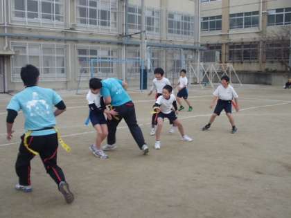 子どもたちは,タグラグビーの試合に参加しました。6年生の体育の学習で,何度も練習してきたこともあって,試合はなかなかスムーズに進められたと思います。でも,やっぱり高校生のみなさんは大きい!ディフェンス,パス,スピード・・・高い技術を間近で見させていただきました。