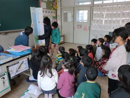 今日は,図書委員の6年生がおはようタイムの時間に1年生の教室で読み聞かせをしました。1年生は楽しいお話に身を乗り出して,夢中になって聞いていました。