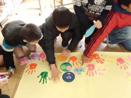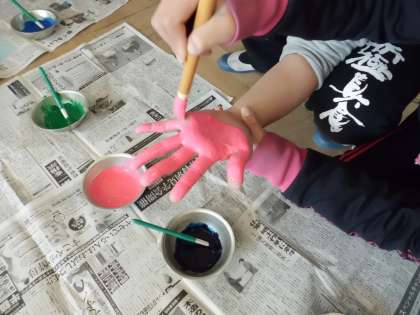 6年生を送る会に向けて,当日体育館に掲示する「おめでとう」の看板を作りました。前回の図工で作ったニコニコマークを貼り,1人1人の手形をおしました。もうすぐ完成です。