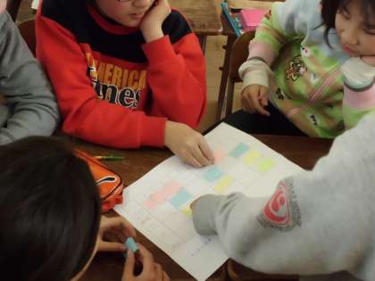 作った音楽は,付せんを使って図形楽譜にしました。自分が演奏する所に自分の色の付せんを貼ることで,どこで自分が演奏するのか,また友達はどの部分で演奏するのかを互いに確認し合いながら作り進めることができました。また,付せんは貼り替えることができるという利点もあり,何度も付せんを貼り替えながら,よりよい音楽を作ろうとしていました。