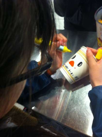マイカップヌードル作りをしました。絵をかいて,好きな味,具材を選んで…