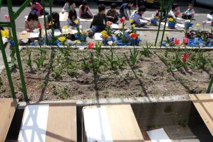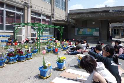 育てたチューリップがきれいに花咲いたので,図工の時間によく見て丁寧に描きました。「チューリップの中に何かあるよ。」「はっぱが重なっているところを描くのが難しいな。」と,晴れ渡る空の下,楽しそうに仕上げていました。