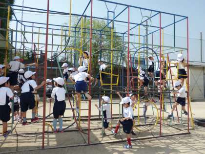 体育の時間に,初めて遊具を使って遊びました。大きな総合遊具や,高さの種類がいくつもある鉄棒,タイヤなど,しっかりとルールを守って仲良く遊ぶことができました。
