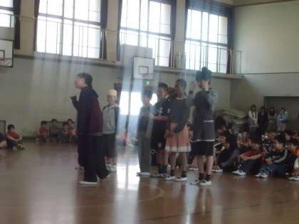 1年生をむかえる会がありました。6年生は,「サザエさん一家」に扮して,1年生にお祝いの言葉を伝えたり,ペットボトルじょうろのプレゼントを贈ったりしました。