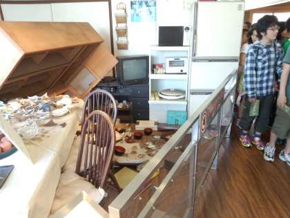続いて,断層の近くにあった家,メモリアルハウスの見学をしました。震災直後の台所の様子も再現されていました。