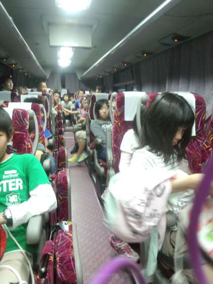 移動のバスの中ではカラオケ大会で盛り上がってる子どもたちです。