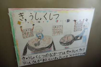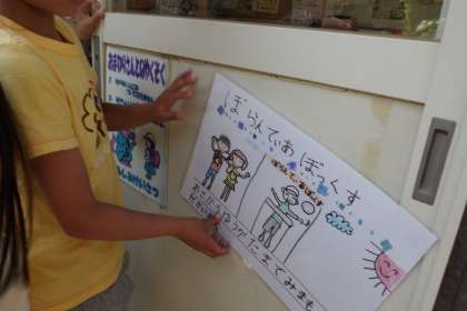 明日はいよいよ学校たんけんの日です。それぞれの教室がどんなところか,1年生に分かるように,かんばんをはりに行きました。