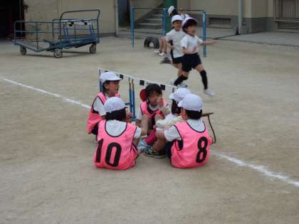はじめの頃は,ボールを前に蹴ることで必死だった子どもたちが,今ではチームごとに作戦を考えています。「ゴール前の人にパスをしてシュートをする。」「ゴールに入れられそうになったら,とにかくボールを蹴って外に出す。」など,子どもたちのアイデアがたくさん出てきています。