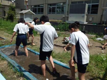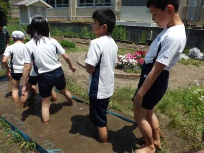 田植えをする前の,準備として『しろかき(土と水をまぜ合わせて条件の良い田作り)』をしました。初めての体験という子が多く,どろの中に足を入れた瞬間,「ひやぁ〜。」「うわ,足がはまった!」と楽しそうに活動していました。暑い日だったので,気持ちよかったです!