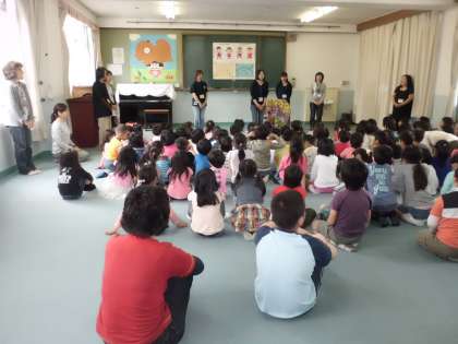 お話の会がありました。手遊び歌のコーナーでは「おべんとうばこのうた」のサンドイッチバージョンを教えていただきました。おにぎりバージョンは前から知っている子どもたちでしたが,サンドイッチバージョンは初めてで,興味津津!とても嬉しそうに見ていました。