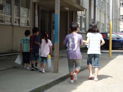 図工室や音楽室などの教室や体育館,学校の安全を見守ってくださっているボランティアボックスなどをまわり,それぞれの場所の役割を説明しています。しんどくなった1年生に「大丈夫?歩ける?」「あと少しやし,がんばろう!」と優しく声をかけている2年生です。