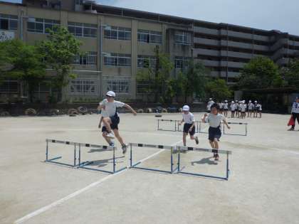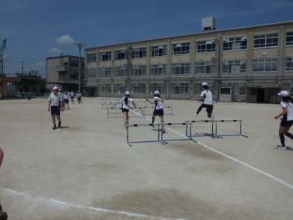 体育でハードル走をしています。目標タイムを目指して,みんな一生懸命に取り組んでいます。