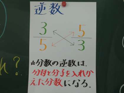 算数で,分数×分数の計算を学習しています。今日は「逆数」について学習しました。「2つの数の積が1になる時,一方の数を他方の数の逆数という」ことを知りました。