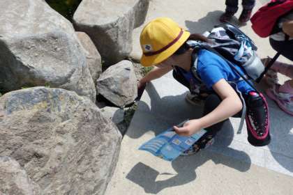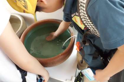 水族館には,海の生き物だけではなく,京都の川や田んぼにいる生き物も展示されています。田んぼのコーナーでは,メダカに夢中になり,川の水の冷たさに驚いていました。