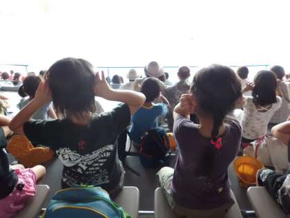イルカの鳴き声を聴こうと,子どもたちは耳をしっかり前へ傾けています。