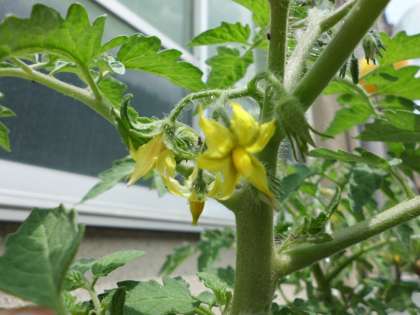 大切に育てているトマトに,かわいい黄色の花が咲きました。