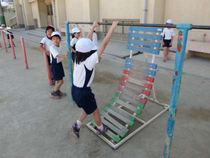 さか上がり補助機を使って,さか上がりに挑戦しています。