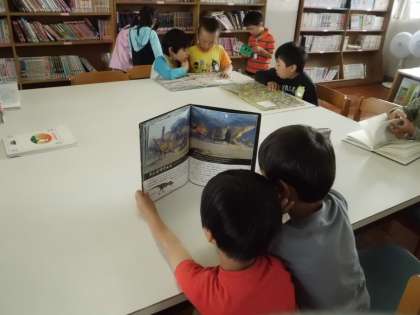 雨が降って外で遊べない日は,図書室に行って本を読みます。仲良く1冊の本を読んでいる人や,絵本の読み聞かせをしている人もいます。