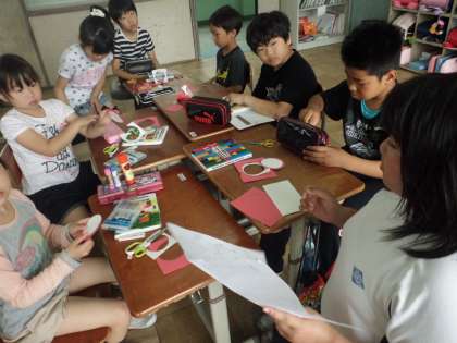 今日は今年度第2回目のスマイル活動の日でした。まずはじめに,リーダーの6年生が,バッジの作り方を説明しました。前回の活動の時に比べ,2回目の活動であることもあってか大分緊張がほぐれている様子でした。たくさんの笑顔あふれるスマイル集会でした。