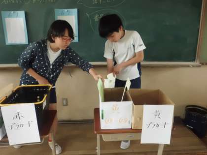 スマイル集会後,グループの友達が作ったバッジを集め,全員の名前を確認し,6年生が責任をもって提出しました。