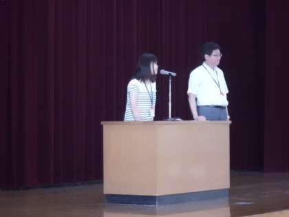 新学期が始まって,2ヶ月。校長先生から,「時」を大切にしていますか?(今,何をするときか考えて行動していますか?)とたずねられ,ひとりひとり自分自身の生活を振り返りました。そのあと,まもなく産休に入られる小篠先生の挨拶と,教育実習生の高安先生の挨拶がありました。