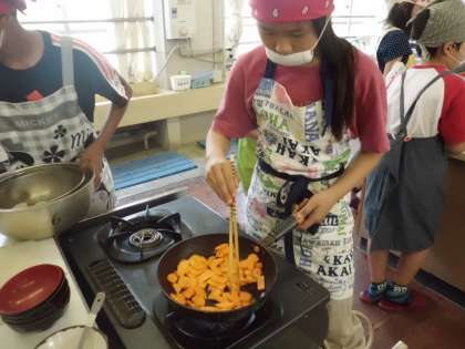 材料を切り終えたら,今度は材料を炒めていきます。子どもたちは硬い野菜のにんじんから炒め始めました。炒める手順はどのグループもばっちりです。野菜がしんなりしてきたら,塩とこしょうで味付けしました。
