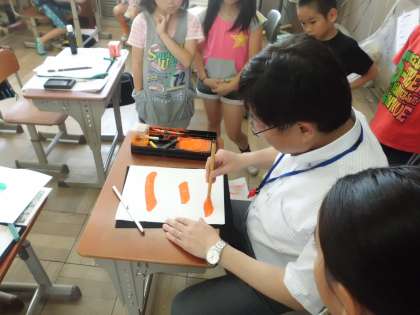 その場でお手本を書いてくれて,できたてほやほやのお手本をもらえる子もいました。後ろから校長先生が書いている姿を見て,書き方のコツを見て学びました。