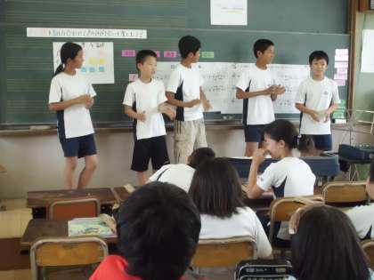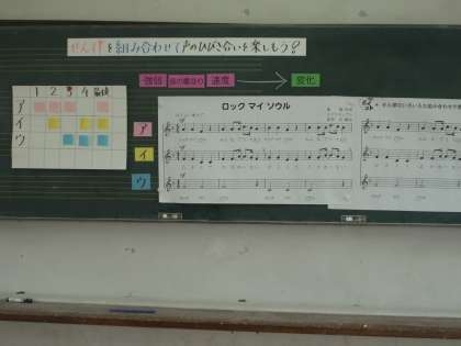 今日は「せん律を組み合わせて声のひびき合いを楽しもう」というめあてで「ロックマイソウル」を歌いました。