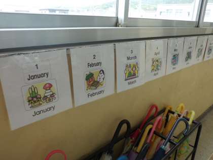 外国語活動で学習した月の英語での言い方を,ろうかに掲示しています。1月(January)からすらすらと言えるよう,がんばっているようです。