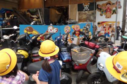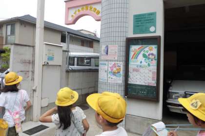 校区たんけんの南コースでは,子どもたちがお世話になっているうずらの里児童館の前を通りました。「○○先生いはるかなぁ。」と中が気になる様子でした。途中,かわいいイラストが描かれたバイクやさんも通り,「子どもに来てほしいからかな?」と,イラストの理由を考えながら歩いていました。
