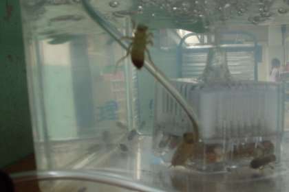 掃除前のプールにいたヤゴを飼っています。大きいのや小さいのがいて,種類が違うのかな。みんなが帰った後,水槽をのぞくと,大きなヤゴが棒に登り始めていました。もうすぐ成虫になるのでしょうか。がんばれ!
