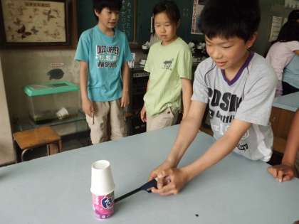 今日は実験をしました。まず,側面に穴を開けたアルミ缶の中にスプレー(ガス)を吹きかけ,その上に紙コップをかぶせます。そして穴に火を近づけると・・・紙コップが勢いよく飛びました。楽しい実験に子どもたちは大喜びでした。