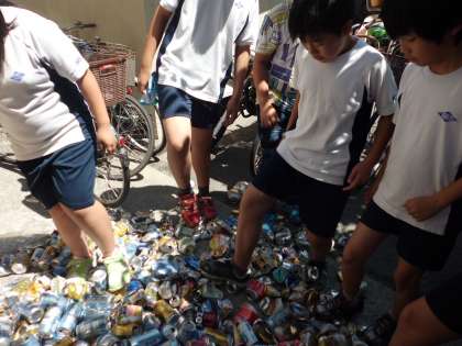 今日は6年生の児童が空き缶ふみを担当しました。たくさんの空き缶を持ってきていただき,ありがとうございます。